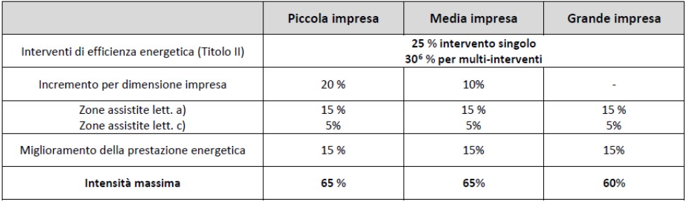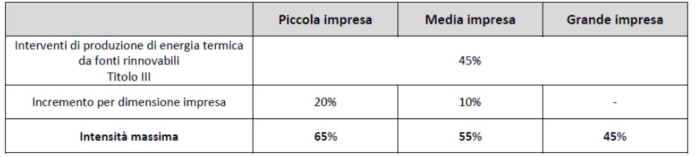 Con riferimento agli interventi di produzione da fonti rinnovabile di cui al Titolo III, l’intensità degli incentivi riconosciuti non può superare il 45% dei costi ammissibili, fatti salvi gli incrementi del 20%, in caso di interventi realizzati da piccole imprese, e del 10%, in caso di interventi realizzati da medie imprese
