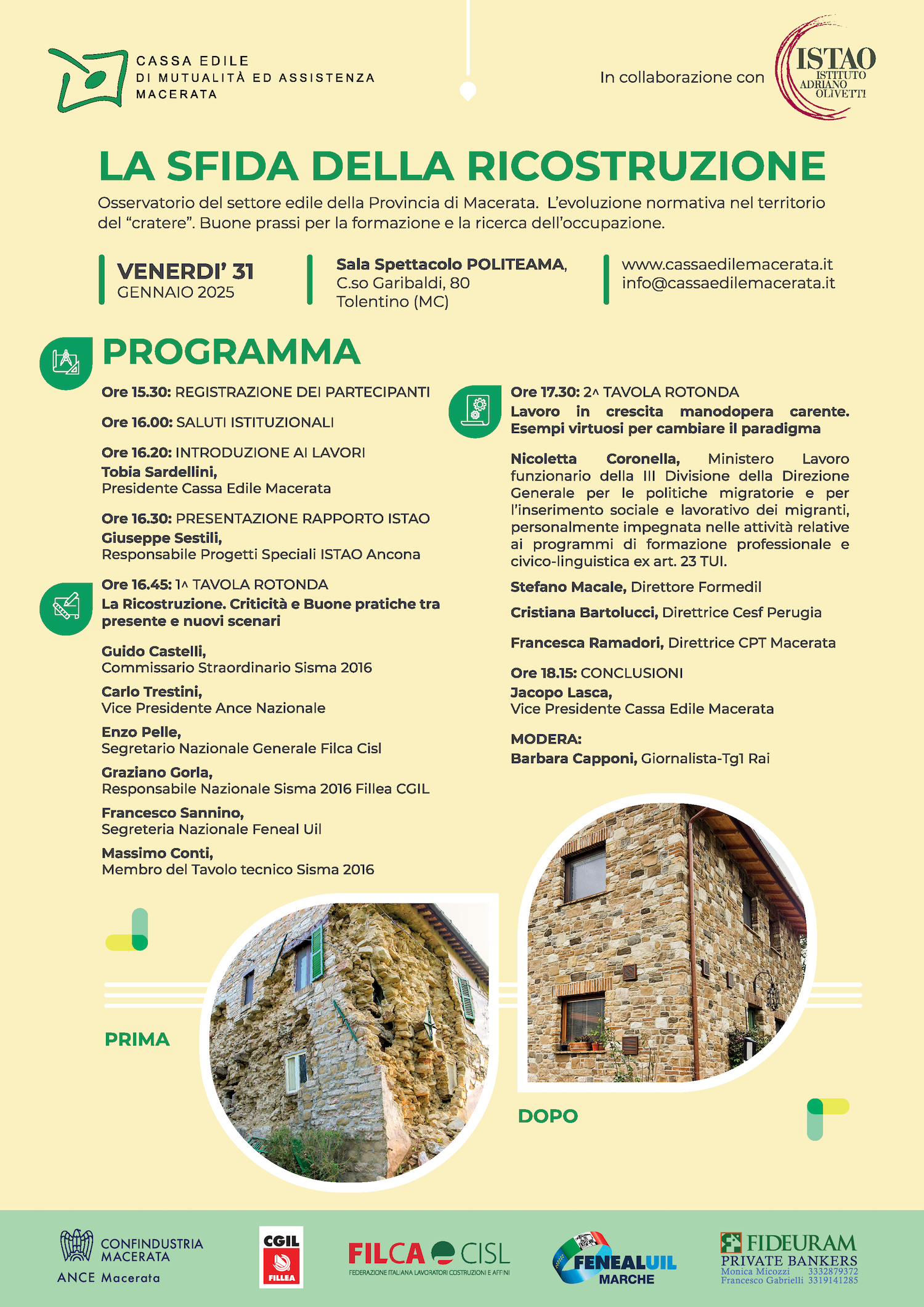 Si svolgerà il 31 gennaio prossimo, con inizio alle ore 15.30, il Convegno - organizzato dalla Cassa Edile di Macerata, in collaborazione con ISTAO: