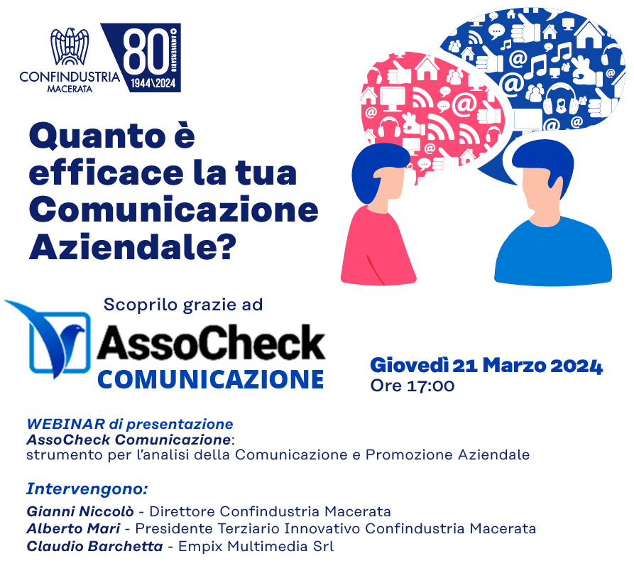 Scritto da Stefano grandinettiIl webinar Assocheck Comunicazione – “Quanto è efficace la tua comunicazione previsto per oggi 21 marzo alle ore 17.00” per motivi tecnici/organizzativi è rinviato a data da destinarsi.