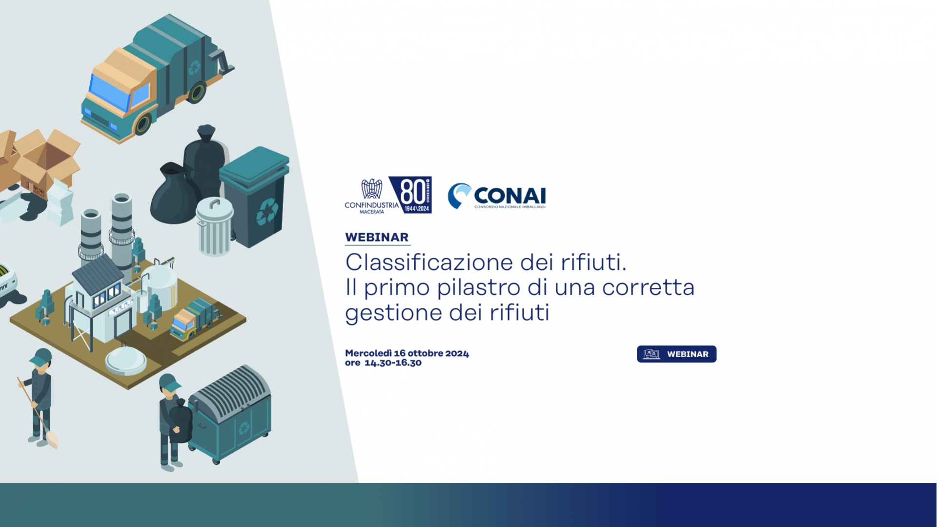 Confindustria Macerata in collaborazione con Conai, Consorzio Nazionale Imballaggi, organizza un webinar d'approfondimento sui principali adempimenti previsti in tema di classificazione dei rifiuti. La classificazione e l’attribuzione del codice sono elementi fondamentali per assicurare la corretta gestione del rifiuto fin dal momento in cui è posto nel magazzino dell’azienda in attesa di essere avviato al recupero o allo smaltimento. Le linee guida del Sistema nazionale per la protezione dell’ambiente contengono indicazioni sulle metodologie da seguire e sulla documentazione da predisporre.