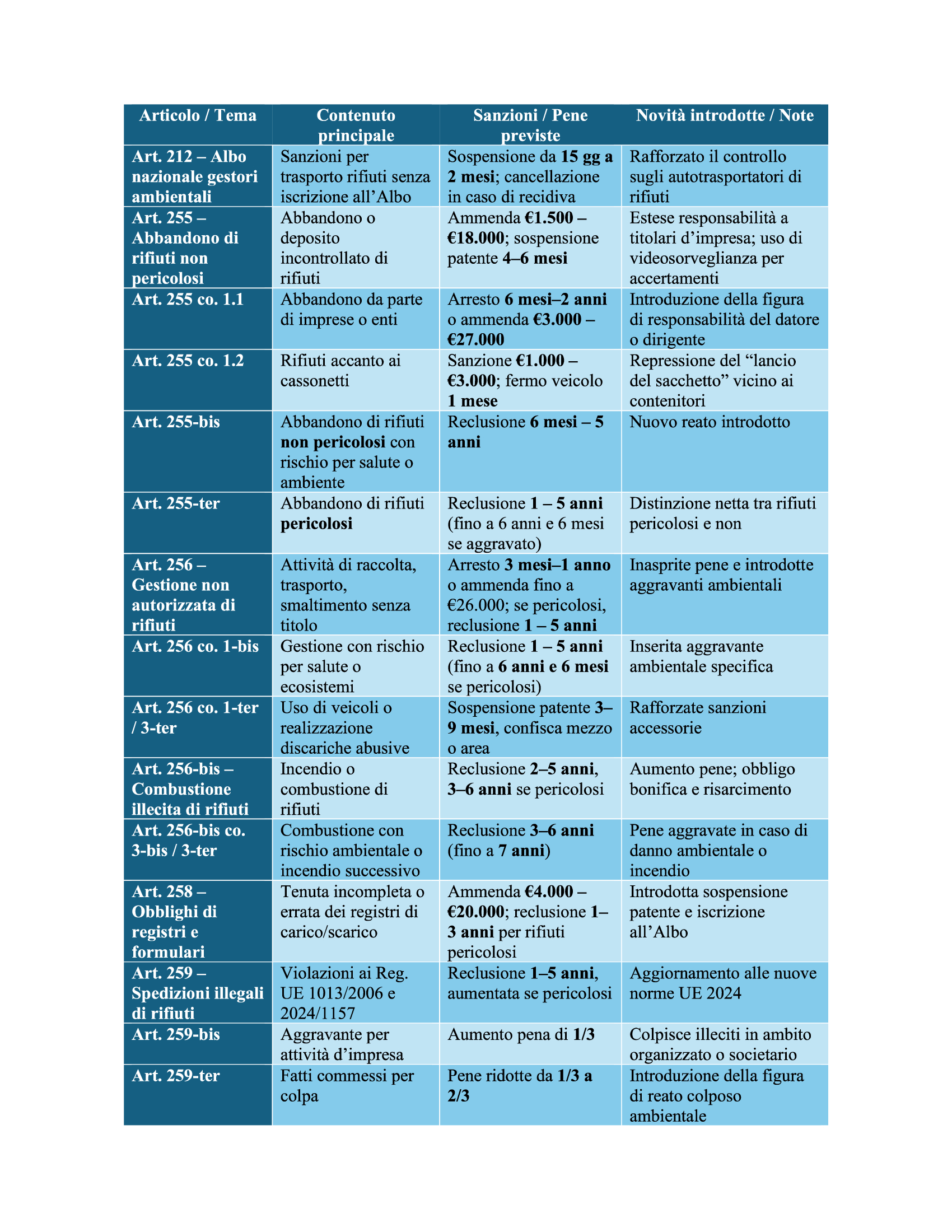 Nello specifico il decreto-legge 8 agosto 2025, n. 116 “Disposizioni urgenti per il contrasto alle attività illecite in materia di rifiuti, per la bonifica dell’area denominata Terra dei fuochi, nonché in materia di assistenza alla popolazione colpita da eventi calamitosi”, convertito in legge 3 ottobre 2025, n. 147, è intervenuto su diversi provvedimenti tra cui il D.lgs. n. 152/2006 (Codice ambiente), il Regio Decreto n. 1398/1930 (Codice penale), D.lgs. n. 159/2011 (Codice leggi antimafia), il D.lgs. n. 231/2001 (Responsabilità amministrativa Enti e società) e il D.lgs. n. 285/1992 (Codice della strada).