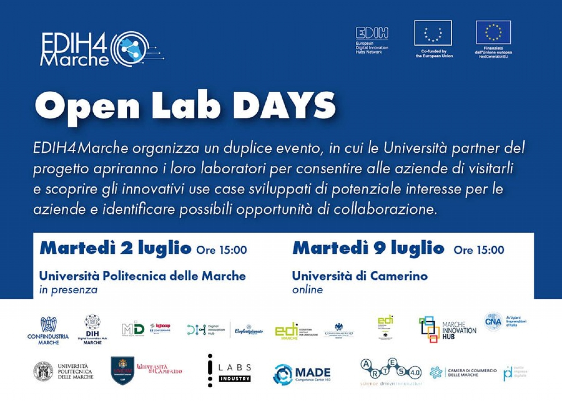 EDIH4Marche organizza un duplice evento, in cui le 2 Università partner del Progetto apriranno i loro laboratori per consentire alle aziende di visitarli e scoprire gli innovativi use case sviluppati di potenziale interesse per le aziende e identificare possibili opportunità di collaborazione.